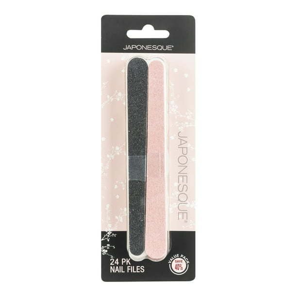 The Japonesque® 24-pack nail files will help keep your natural nails beautifully groomed. These nail files are perfect for natural nails and ideal for shaping edges, smoothing snags, or filing down broken nails. Dual-sided with pink & black finishes, they resist bending and are long-lasting. The convenient multi-pack means you can leave one in every drawer, purse, and travel bag.