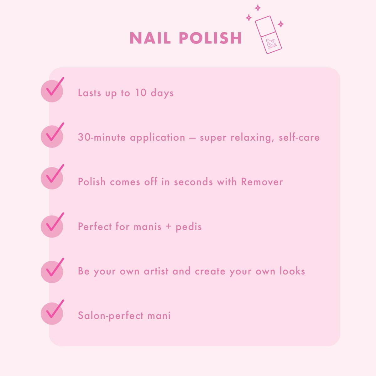 Every perfect mani needs a perfect top coat. Apply a layer of this super shiny top coat as the last step to keep your mani looking fresh for 7+ days. Applies smoothly with a super-shiny finish. Always cruelty-free, vegan, and 7 free (Our polish does not contain dibutyl phthalate (DBP), toluene, formaldehyde, formaldehyde resin, camphor, ethyl tosylamide, or xylene.).