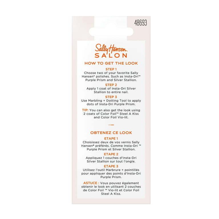 "Bring the salon to you with our Sally Hansen Salon Pro Tool Kit. Use the Marbling + Dotting Tool, Detailer Tool, and Striping Brush for all +I16:M16your creative designs from the comfort of your own home. Nail art made simple. Create a salon look at home by following these simple steps: Step 1: Choose two of your favorite Sally Hansen polishes, such as Insta-Dri® Purple Prism and Silver Stallion. Step 2: Apply 1 coat of Insta-Dri Silver Stallion to entire nail. Step 3: Use Marbling + Dotting Tool to apply dots of Insta-Dri Purple Prism."